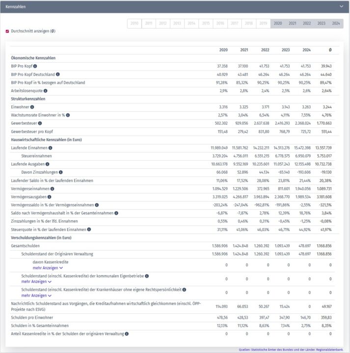 Die wesentlichen zentralen ökonomischen und strukturellen Daten sowie Haushalts- und Schuldendaten werden übersichtlich pro Haushaltsjahr seit 2010 für alle deutschen Gebietskörperschaften dargestellt. Dazu gehören amtsfreie, amtsangehörige Gemeinden, deren Zusammenschlüsse in haushaltsführenden Gemeindeverbände sowie Landkreise und kreisfreie Städte.