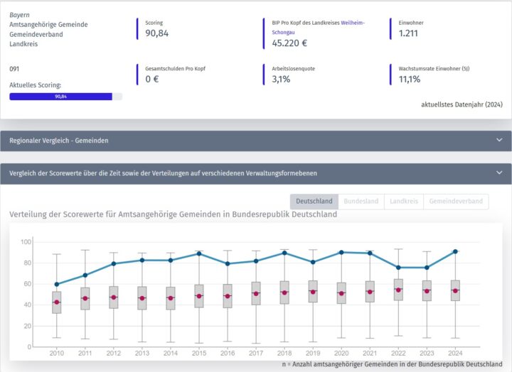 Eine integrale Funktion der Webanwendung ist neben dem direkten Vergleich mit einer anderen Gebietskörperschaft eine deutschlandweite Einschätzung der Ergebnisse einer analysierten Kommune. Solch eine Einschätzung ist über den Vergleich mit Körperschaften gleicher Verwaltungsform (Gemeinden, deren Verbänden, Land- oder Stadtkreisen) auf verschiedenen regionalen Stufen möglich. Die Betrachtung über die Zeit seit 2010 ermöglicht es, die Stabilität der Ergebnisse einzuschätzen.